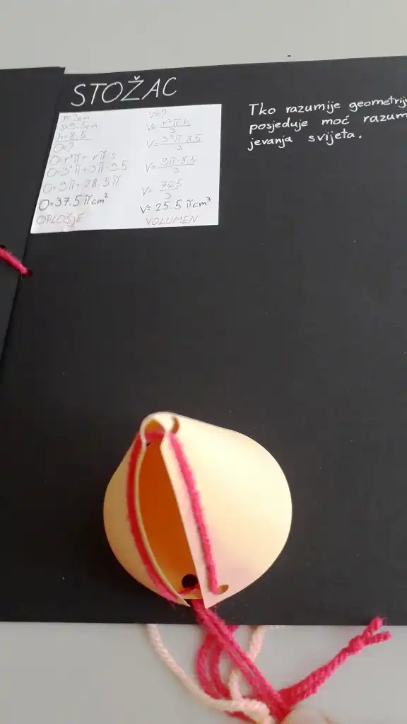 Za kraj osmog razreda dobili su za napraviti jedan oblik matematičkog maturalnog rada. Trebali su napraviti mreže geometrijskih tijela od papira i konca te povlačenjem konca od mreže tijela dobiti geometrijsko tijelo. Malo praktičnog rada i primjene matematike za kraj osnovne škole. Bili su vrijedni i marljivi, puno sati je utrošeno kako bi se napravio ovaj zadatak. Uz praktičan rad mjerili su potrebne veličine te računali oplošje i volumen svakog izrađenog tijela.