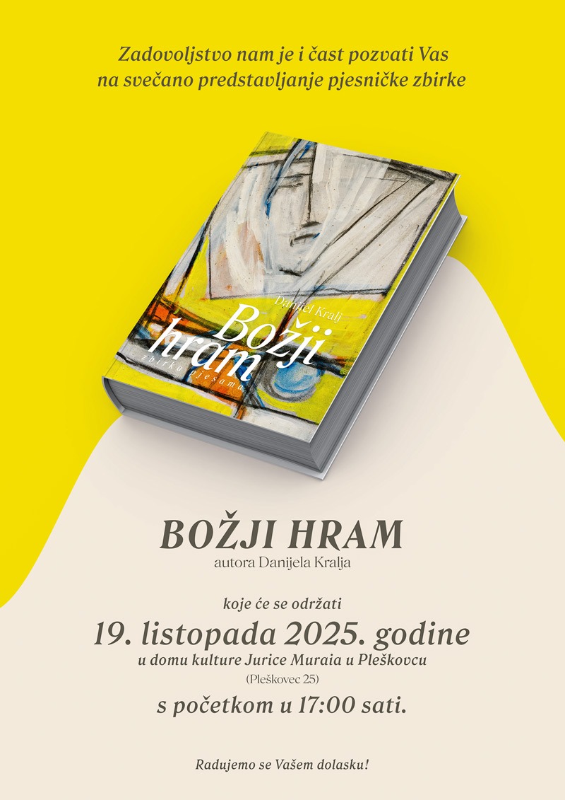 Zadovoljstvo nam je i čast pozvati Vas na svečano predstavljanje pjesničke zbirke „Božji hram” autora Danijela Kralja, koje će se održati u nedjelju, 19. listopada 2025. godine, s početkom u 17:00 sati, u domu kulture Jurice Murai u Pleškovcu (Pleškovec 25). Nova zbirka donosi duboke i nadahnjujuće stihove koji promišljaju o vjeri, čovjeku i duhovnosti, […]