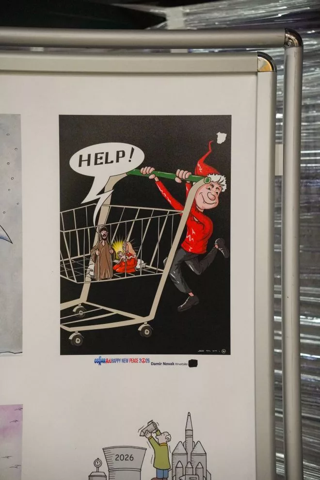 Druga njegova karikatura prikazuje zlog čovječuljka u božićnoj uniformi kako u kolicima vozi Svetu Obitelj.