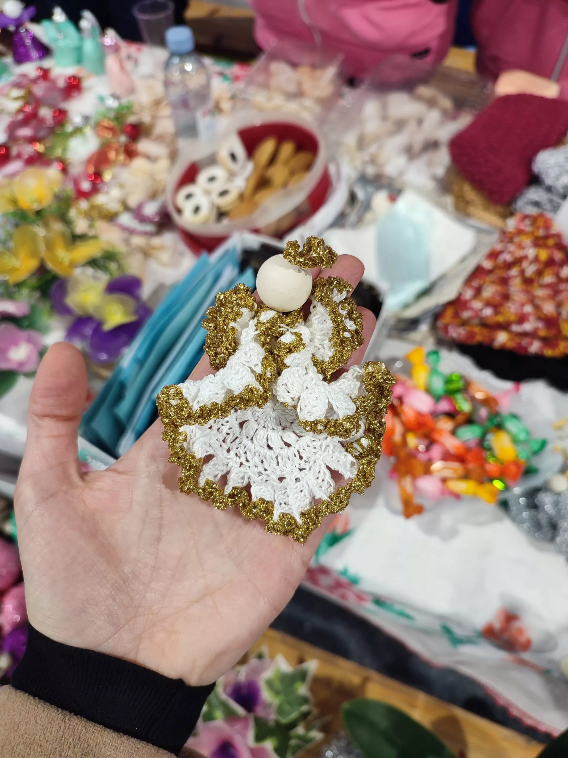 Od štrikanih ukrasa, posebno su se istaknule ružičaste “kuglice” za bor i bijelo-zlatni anđeli s drvenom kuglicom kao glavom.