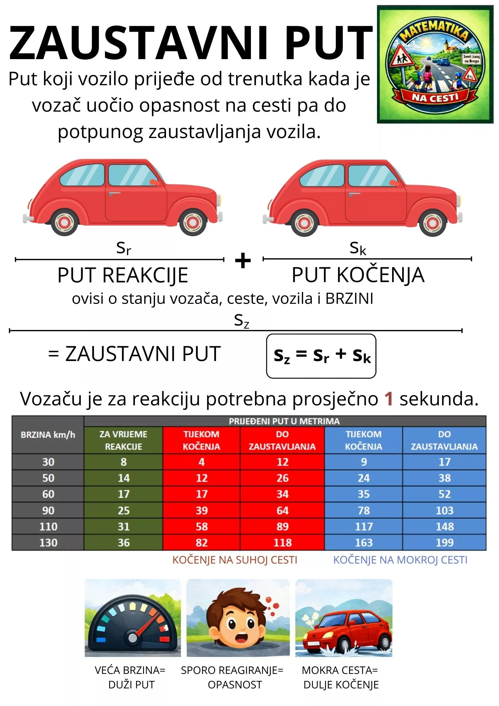 - zaustavni put vozila pri različitim brzinama