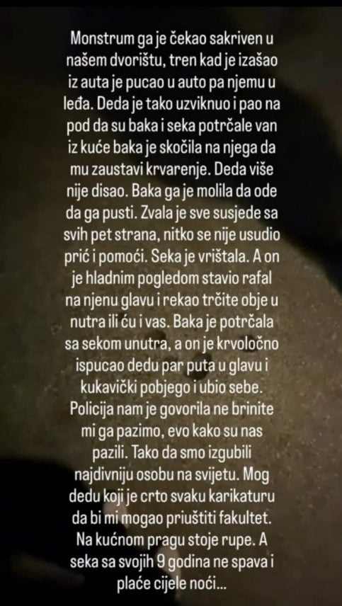 “Monstrum ga je čekao sakriven u našem dvorištu, tren kad je izašao iz auta je pucao u auto pa njemu u leđa. Deda je tako uzviknuo i pao na pod da su baka i seka potrčale van iz kuće baka je skočila na njega da mu zaustavi krvarenje. Deda više nije disao. Baka ga je molila da ode da ga pusti.