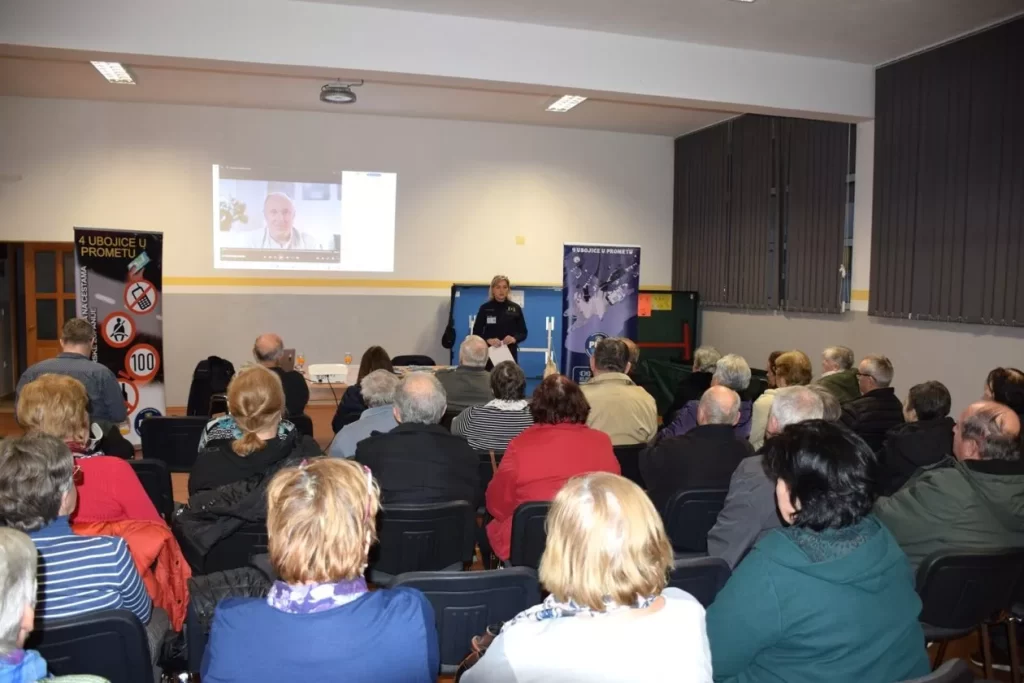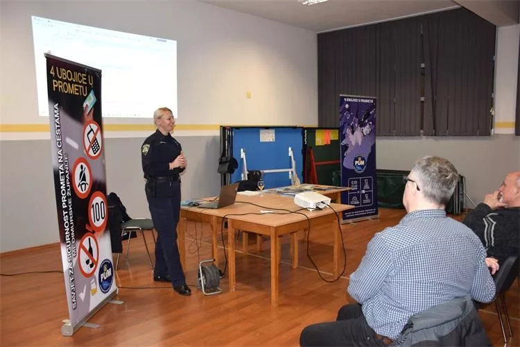 Sudionici su upoznati s najčešćim uzrocima prometnih nesreća te konkretnim mjerama prevencije za sigurnije sudjelovanje u prometu, kako u ulozi pješaka tako i vozača. Posebna pažnja posvećena je pravilnom prelasku kolnika, vidljivosti u prometu, poštivanju prometnih propisa te rizicima koji nastaju zbog fizioloških promjena u starijoj dobi, poput smanjenih refleksa, slabijeg vida i sporije reakcije. Predavanje je provedeno interaktivno, uz aktivno sudjelovanje umirovljenika kroz pitanja i raspravu.