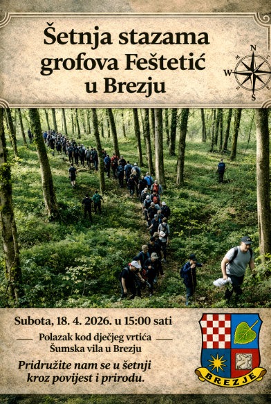 U subotu, 18. travnja u 15 sati organizira se šetnja stazama grofova Feštetića u Brezju. Okupljanje je kod vrtića Šumska vila, a sudionike očekuje trosatna šetnja kroz prirodu, uz zanimljive priče o povijesti kraja.
